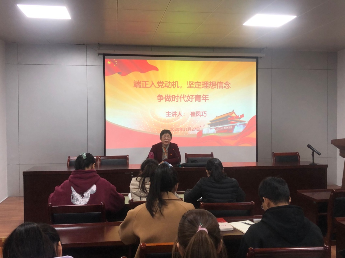 2020年11月27日,我院在S302会议室举行了第六十四期分党课培训第六讲,主讲人为我院正处级组织员崔风巧,主题为“端正入党动机,坚定理想信念”,全体入党积极分子参加。