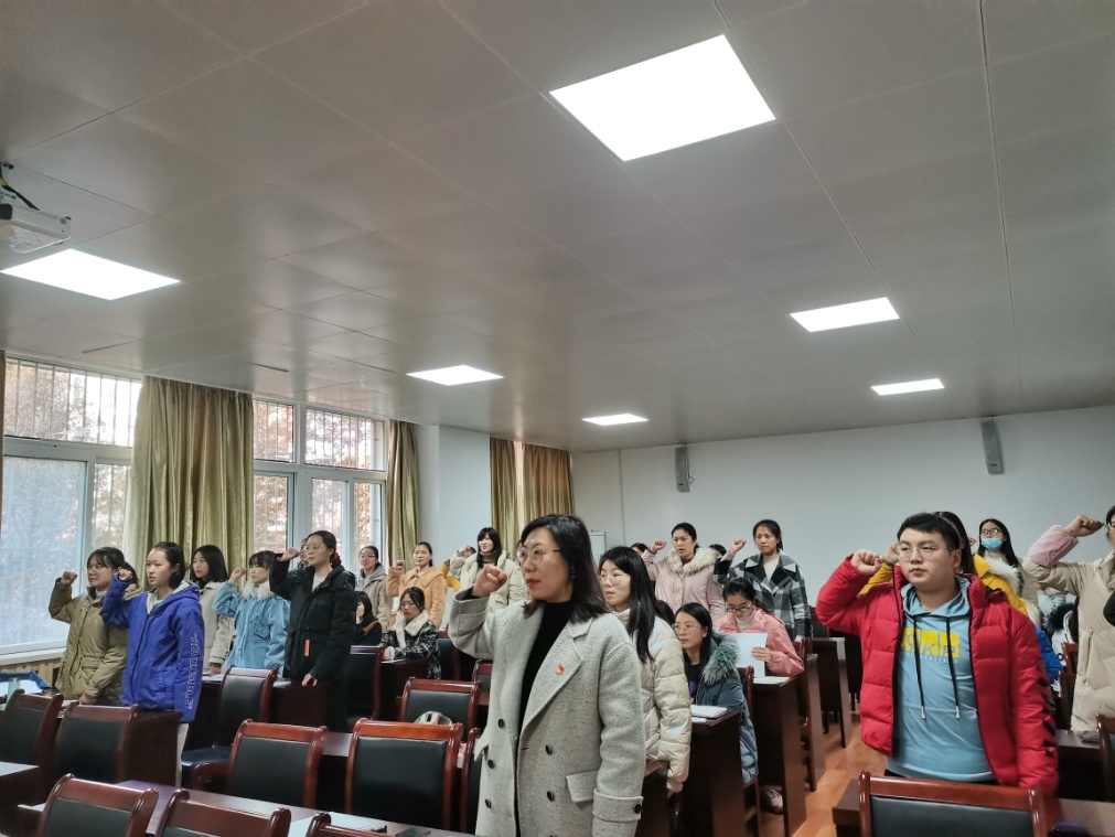 会上,胡泊老师带领学生党员伴随着庄重严肃的国际歌进行光荣而神圣的宣誓仪式。“请全体起立,举起右拳,跟我宣誓”在胡泊老师的带领下,所有学生党员起立举右拳,面对神圣的誓词进行庄重宣誓:我志愿加入中国共产党,拥护党的纲领,遵守党的章程,履行党员义务,执行党的决定,严守党的纪律,保守党的秘密,对党忠诚,积极工作,为共产主义奋斗终身,随时准备为党和人民牺牲一切,永不叛党。