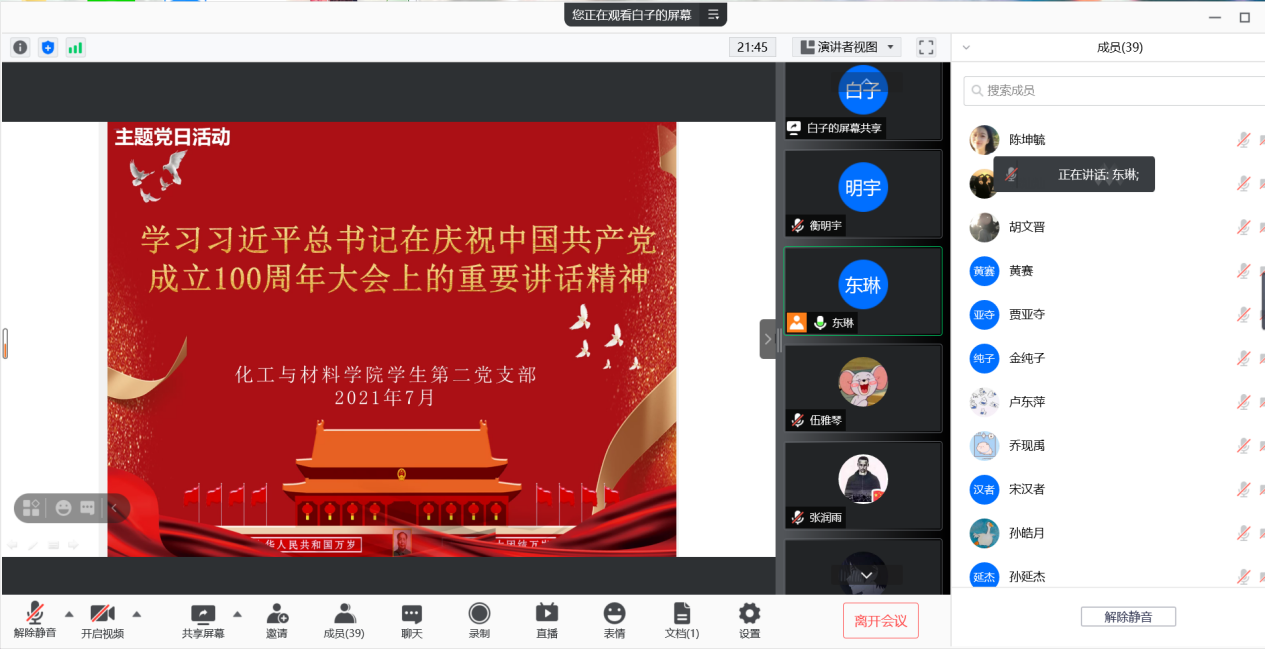 2021年7月27日,我院学生第二党支部通过腾讯会议召开“学习习近平总书记在庆祝中国共产党成立100周年大会上的重要讲话精神”主题党日活动,支部书记张东琳老师和全体学生党员参加此次活动。