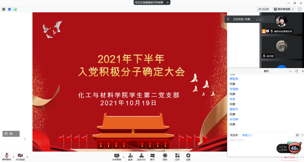 张东琳老师和其他推荐人依次介绍了陈昱阳等34名入党积极分子在思想、学习、生活等方面的基本情况并简单点评,与会党员积极发表了对各位入党积极分子的了解和意见。之后经支部全体党员网上投票表决,一致同意将陈昱阳等34位同学确定为入党积极分子。