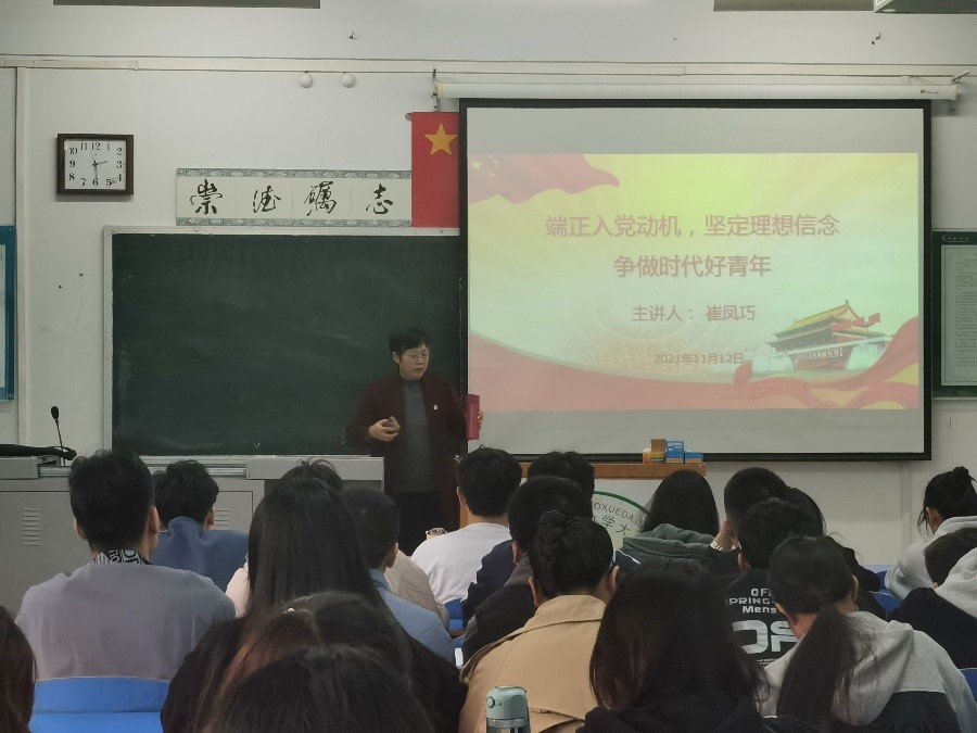 崔凤巧书记以“端正入党动机,坚定理想信念,争做时代好青年”为主题,依次从“入党动机的概念”、“入党动机的种类”、“端正入党动机的意义”、“怎样端正入党动机”等方面进行叙述。将党的理论知识与同学们的日常生活相结合,使同学们切实感觉到党的知识不仅一种理论,更是在客观分析党情的基础上形成和发展起来的;通过邱少云、雷锋等革命先辈的英勇事迹,鼓励大家要有坚定的理想信念,能够严格要求自己、认真履行自己的职责,要有吃苦在前、享乐在后的先锋精神,努力学习,不断地加强思想锻炼,不仅在组织上入党,还要在思想上和行动上入党,起到先锋模范作用。