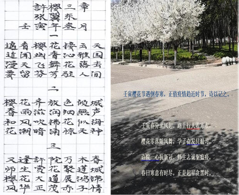 此次活动共收到教职工的自创作品,包括诗词、手绘、摄影、手工作品、小视频等一百多件。其中,诗词作品方面,何伟伟教授的“花开似锦美人面,落樱如缤酒如川,花开花落总归土,繁华尽处是尘缘。”、“粉色无数抖芬芳,隔壁新柳垂青黄,花本不为游人开,此间无人寥惆怅。”道尽了樱花的花繁似锦、满树烂漫、如云似霞;张翼东博士的“许樱三章”,让我们既欣赏到了许院樱花的芬芳,也领略了张博士的赤子豪情;还有张立科博士的随笔,给我们描绘了疫情环境下,许院师生齐心抗疫、众志成城的画面;还有……