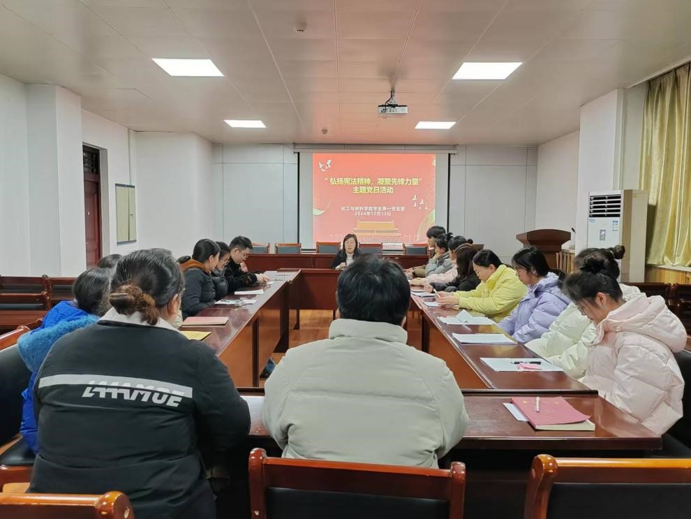 2024年12月13日,我院学生第一党支部在化材楼S302会议室召开“弘扬宪法精神,凝聚先锋力量”主题党日活动。学生第一党支部书记胡泊老师及全体学生党员参会。