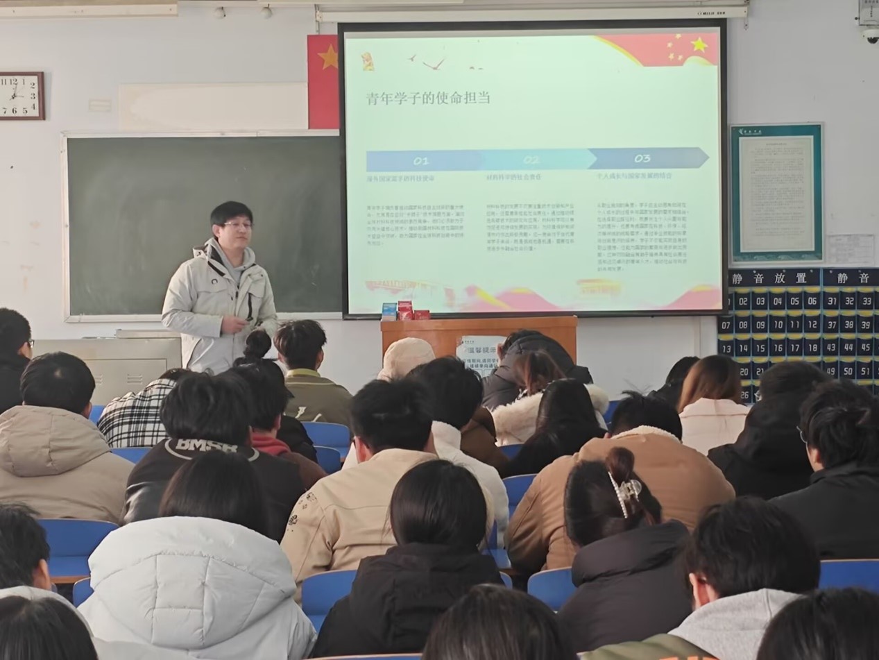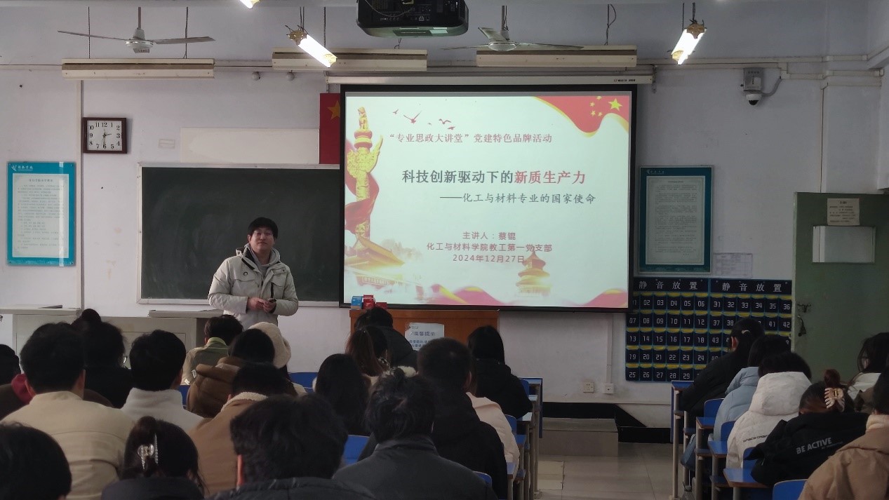 2024年12月27日,我院教工第一党支部在C-301教室开展党建品牌活动“专业思政大讲堂”第二讲《科技创新驱动下的新质生产力——化工与材料专业的国家使命》。本次讲座由支部组织委员蔡锟博士主讲,活动旨在深入贯彻党的教育方针,紧扣新时代中国科技创新的战略需求,结合“新质生产力”的时代背景,深入探讨了化工与材料专业在国家发展中的关键作用,为青年学子指明未来发展的方向。
