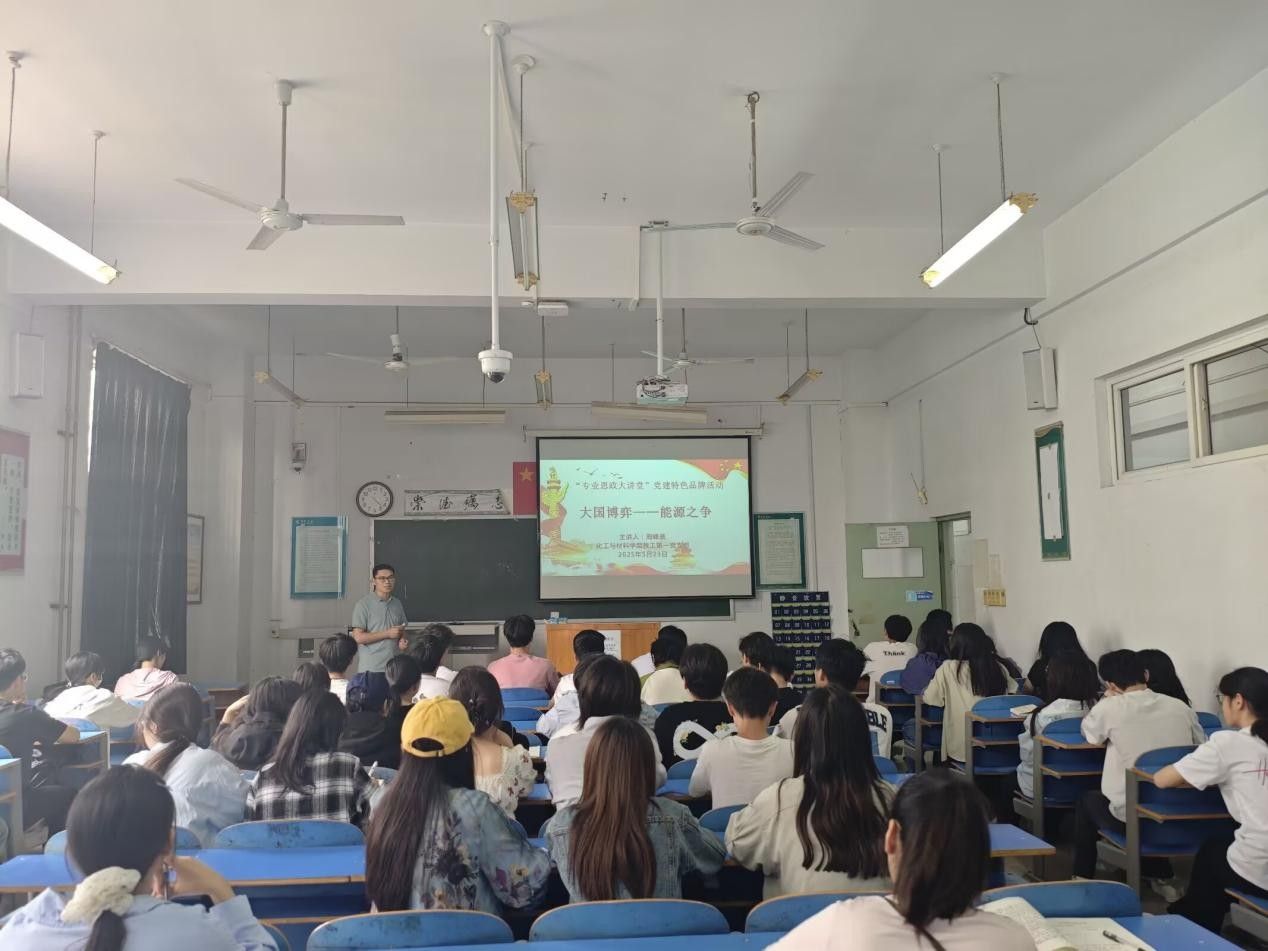 教工第一党支部宣传委员周峰晨老师主讲培训第四讲:大国博弈-能源之争。周老师以石油危机入手,通过建立港口、保卫资源、寻找替代等方式解决问题。启发作为化材人应从安全、高容量,快充、低温、废旧再生与回收等领域研究锂离子动力电池,助力国家汽车产业发展,为国家发展贡献自己的力量。