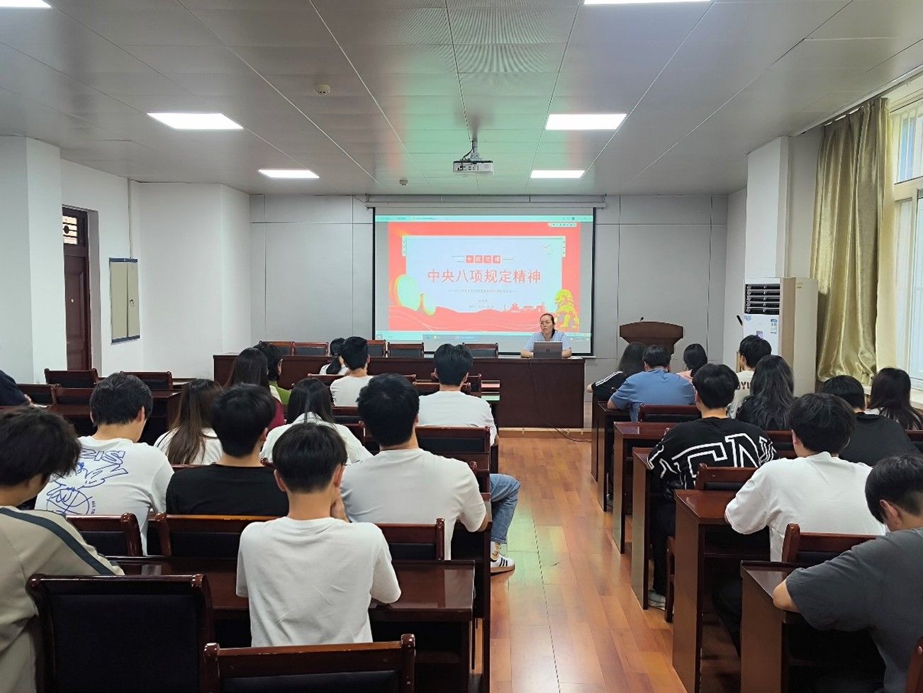 教工第三党支部书记钞春英老师主讲了培训第七讲:深入解读中央八项规定精神。钞老师围绕“什么是中央八项规定”“中央八项规定精神内涵”“违规具体表现”及“相关党纪条规”展开讲解。从规定的出台背景与具体要求,到精神实质的剖析,再结合典型案例揭示违规风险,条分缕析、案例鲜活,让学员深刻认识到严守纪律的重要性。