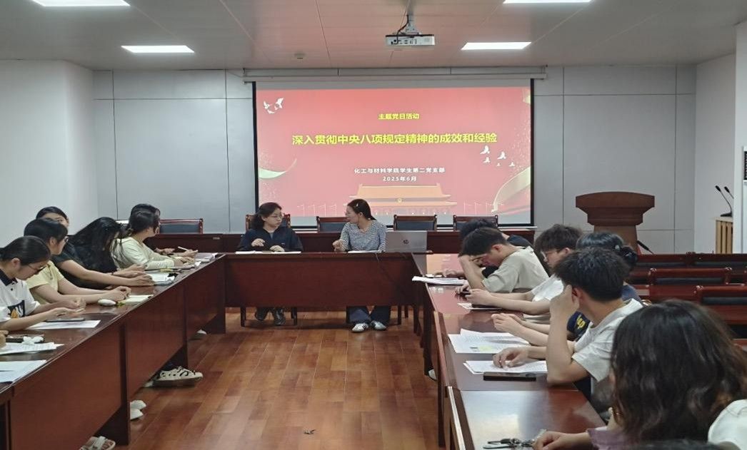 2025年6月13日,我院学生第二党支部在化工与材料学院S302会议室开展集中学习深入贯彻中央八项规定精神的成效和经验要点主题党日活动,本次会议由学生第二党支部书记王濛濛同志主持,支部全体党员参会。