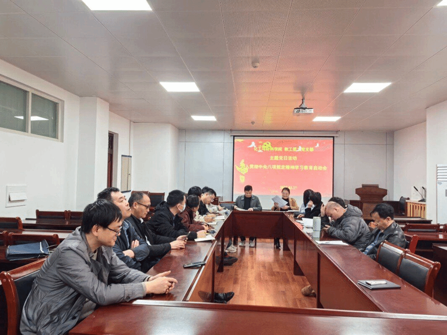 支部书记韩培林传达了上级党委关于开展中央八项规定精神学习教育的工作要求,并对学习教育进行了全面部署。要求全体党员同志要深刻认识学习教育的重要意义,以高度的政治自觉和行动自觉投入到学习中。院组织员胡泊老师就违反中央八项规定及其实施细则精神的反面典型案例进行详细通报,并要求全体党员干部要切实从典型案例通报中汲取教训,自觉遵守中央八项规定及其实施细则精神,坚决杜绝侥幸心理和麻痹思想。要以案为鉴、以案促改,切实增强纪律意识和规矩意识,做到心有所畏、言有所戒、行有所止。