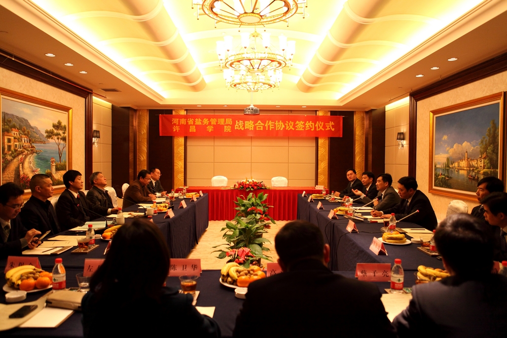|  11月12日,我校与河南省盐务管理局(河南省盐业总公司)战略合作协议签字仪式在郑州永和铂爵国际饭店会议中心举行,双方将在新型盐产品及相关领域科研资源整合、教育人才培养等方面开展全面合作。河南省盐务管理局局长赵启林,副局长夏国政、许卫苏,许昌市人民政府副市长赵振宏,我校党委书记王清义、院长陈建国、党委副书记王洪彬等出席签字仪式。  签字仪式上,河南省盐务管理局赵启林局长指出,双方建立全面合作关系,将实现双方互惠互利的新发展,共同促进地方建设与经济发展,服务中原经济区。此次合作,将推动河南省盐业及相关战略性新兴产业领域的发展,提升河南省盐业系统自主创新能力和产业竞争力,拉伸产业链,提升盐产品附加值;通过合作,也将推动许昌学院产学研平台建设和科技成果转化,促进高端人才引进,提高科研水平和人才培养质量。 王清义书记代表学校讲话。他指出,大力推进产学研合作,培育办学特色,服务地方发展,是我校坚定不移的办学方针。  近年来,我校牢牢把握“地方性、应用型”的办学定位,充分发挥自身优势,不断加强与地方优势企业和行业的合作,在提升人才培养质量、提高办学效益以及提升服务社会能力方面取得了积极成效。我校与河南盐务管理局进行全方位合作,标志着我校产学研合作办学的不断加强与深化。他强调,通过双方的协同努力,一定会实现教育、科研和产业资源的深度融合,在合作共赢的道路上共同推动教育事业和盐产业的协同发展,共同为经济社会发展做贡献! 赵振宏副市长表示,许昌市将不断加快公共服务设施建设,切实利用许昌市人力和社会资源,为合作协议的实施提供政策支持,协助河南省盐务管理局和许昌学院落实后期产业发展问题。 随后,陈建国院长代表学校与河南省盐务管理局赵启林局长签署《河南省盐务管理局—许昌学院合作战略协议》。(图片由院长办公室提供)