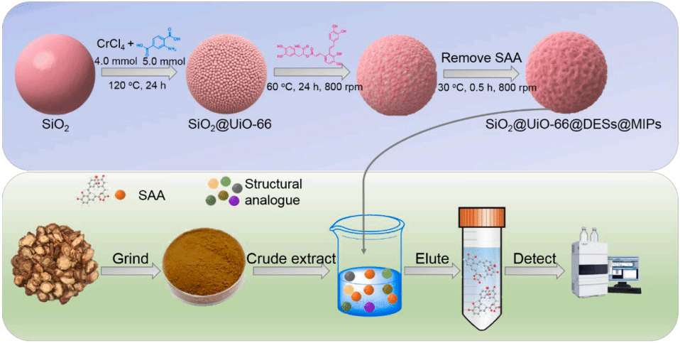 系列工作分别以“Metal-organic framework composites-based molecularly imprinted polymers functionalized with deep eutectic solvent for selective extraction of Salvianolic acid A from Salvia miltiorrhizae Radix”(Journal of Chromatography A, 2025, 1760, 466312),“High-efficiency UiO-66 decorated flower-like molecularly imprinted polymers for the selective enrichment of chrysin from propolis”(Journal of Chromatography A, 2025, 1759, 466256), “Acid-resistant molecularly imprinted polymers based on in-situ generated Metal-Organic Frameworks: A novel solid-phase extraction adsorbent for selective enrichment of salvianolic acid A from Salvia miltiorrhiza (Microchemical Journal, 2025, 217, 114966)”为题发表在Journal of Chromatography A和Microchemical Journal等国际期刊。 本系列研究通过将MOF的高比表面积、有序孔道结构与MIPs的精准分子识别能力有机结合,成功构建了一系列具有高吸附量、优异选择性和良好稳定性的复合材料,为推动天然产物中目标成分的高效分离及高值化利用提供了中药的材料基础与方法参考。我院孙燕华为系列工作第一作者,王晓博、谢智宇副教授、许志红教授分别为通讯作者。