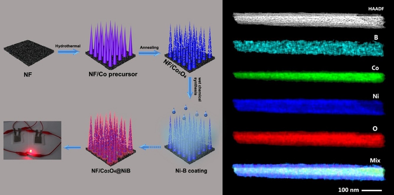 随着社会的高速发展,新奇的终端电子产品层出不穷,对于能源的需求不断提高,促使人们探索高效的能源存储系统。超级电容器作为一种主要的供能装置,由于其具备快速充放电、高能量密度、长时间的循环稳定性和可靠性等性质,使其得到了大量的关注和研究。合成具有高活性的赝电容电极材料能够有效提升超电的综合性能。本文提出了一种给电极材料穿上“增幅衣”的概念,基于湿化学浸渍法,在赝电容电极材料Co3O4微纳阵列表面上原位生长一层无晶态Ni-B膜,Ni-B膜在电子传递过程中不仅可以提供更多的活性位点,还可以防止已合成的电极材料在催化过程中聚集。受益于Ni-B膜与基底Co3O4的强耦合作用,所合成的Co3O4@NiB复合电极材料在2.5 mA cm−2电流密度下拥有大面积电容 3.47 F cm−2 (0.48 mAh cm−2),并且循环2000次,仍保持着95.5%的容量。该方法操作简单、适用性广,能够有效促进电池电极材料的发展。