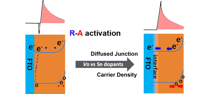 在典型的半导体光电器件中,n-型半导体受光激发时能够在价带产生空穴、导带产生电子,进一步在内建电场的作用下传输到半导体/空气界面和半导体/FTO界面。通常的观点认为半导体的导电性是载流子迁移、扩散距离的决定因素,因此许多其他研究组通过控制Sn掺杂、氧空位来调节氧化铁的掺杂浓度。与此不同,本工作利用我校的瞬态表面光电压和导电原子力显微镜等设备,证明通过预还原-再氧化两步法能够同时提高氧化铁的微观导电性、降低氧化铁/FTO界面的载流子复合。其中氧空位导致的Sn、Fe原子在界面的相互扩散由Liu Rui博士采用X-射线光电子能谱的深度剖析得以证实。该研究结果对于如何提高半导体中光生载流子的传输与界面组成调控具有重要价值,对于光电器件的性能提高具有重要意义。