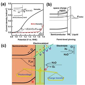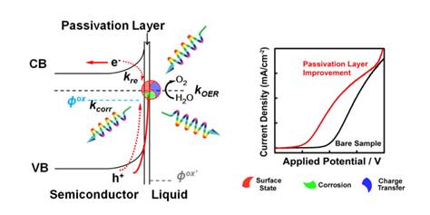(Enhanced Photoelectrochemical Water-Splitting Performance of Semiconductors by Surface Passivation Layers, Liu Rui;Zheng Zhi;SpurgeonJoshua;Yang Xiaogang.Energy & Environmental Science, 2014, 7, 2504) 通过对半导体表面态的钝化,光生载流子在表面态发生复合的几率大大降低,相应地光生载流子在表面发生氧化还原水反应的几率得以提高。另外,通过沉积析氢或析氧催化剂,修饰半导体表面以降低表面氧化还原反应的势垒,光电氧化还原水反应的过电势得以降低,导致光生载流子向水分子转移速度加快。然而催化剂薄膜的引入并不是一种简单的A+B复合结构,必然起到协同提高作用。例如,通过MnO析氧催化剂修饰Fe2O3光阳极的研究,表明催化剂既能加快电极表面的氧化反应速度,又能影响Fe2O3半导体的光生电压。合适的调节、构造半导体-表面层界面显得尤为重要。本文总结了催化剂-半导体结构对光生电压的影响,提出了提高效率的基本原则:催化剂的引入既不能降低表面光电化学氧化还原的反应动力学过程,又不应该降低半导体光生电压这一反应热力学过程。此外,论文通过总结表面修饰层的腐蚀电位调控、纳米结构构筑,沉积厚度等因素的影响,提出抑制表面光电化学腐蚀的机制,并预测了一系列可用作表面保护层的化合物。
