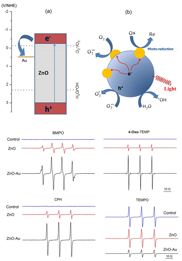 图1.利用电子自旋共振技术揭示ZnO/Au杂化纳米结构光催化活性和抗菌活性的增强作用。