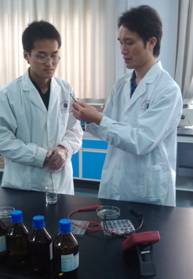 雷岩同学(右)与参加创新实验课程的本科生正在测试太阳能电池性能