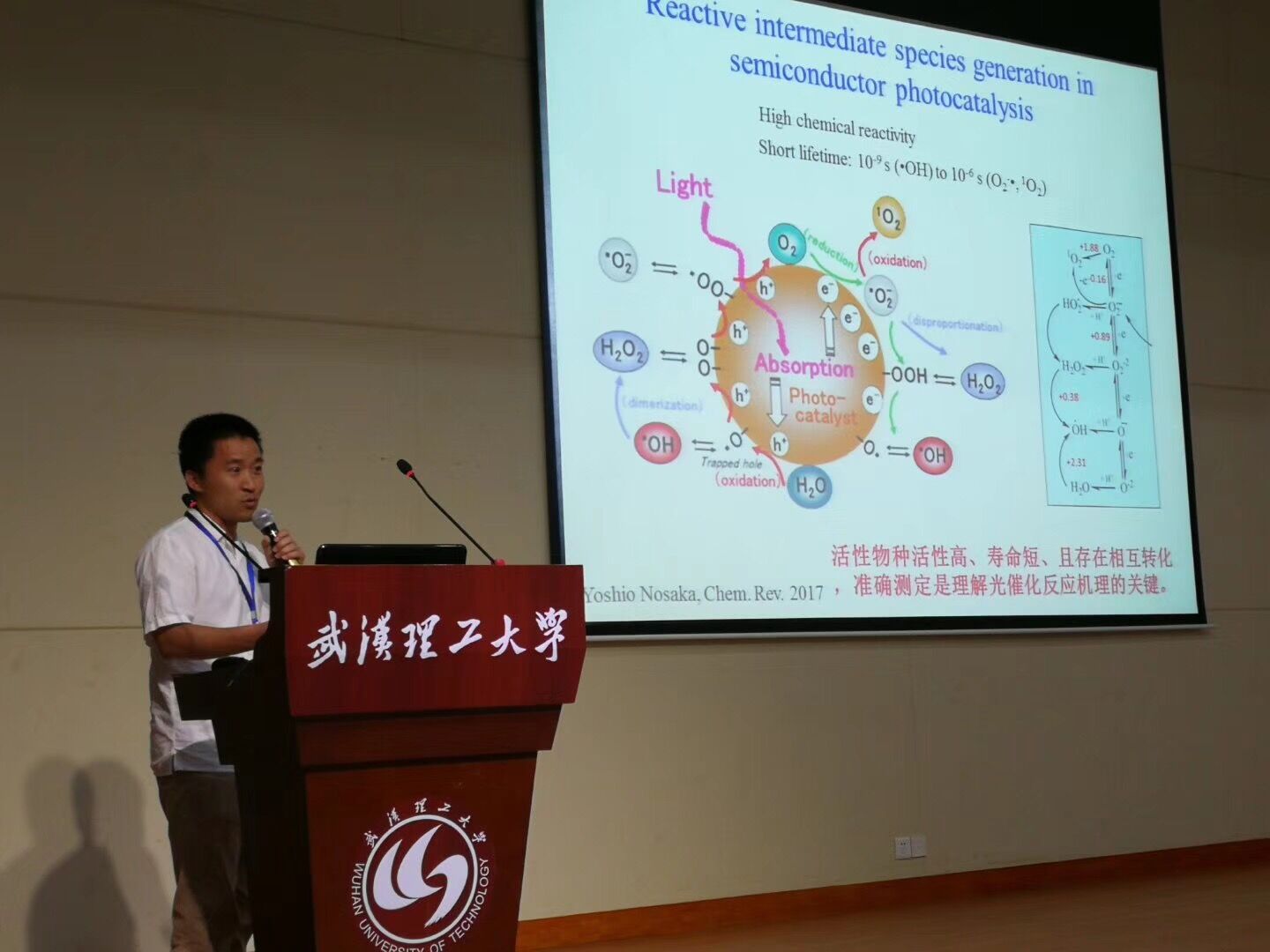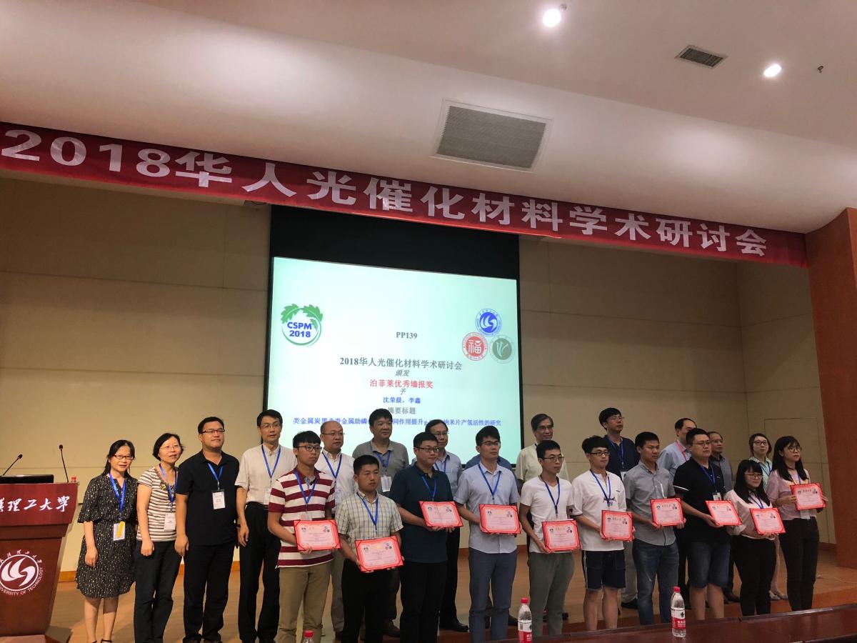会议内容涵盖大会报告、主题报告、邀请报告、口头报告、墙报展示以及光催化产品展览,并设立优秀墙报奖。与会专家学者从不同角度报告了光催化制氢、光催化还原二氧化碳、光催化合成等领域的最新进展,并就相关问题展开热烈讨论。何伟伟博士受邀在大会作了题为“光生活性中间物种的测定及光催化反应行为”的邀请报告。铁伟伟博士以海报的形式展示了最近在ZnO/碳纳米管杂化体系光催化活性的研究成果。闭幕式上,郑直教受大会组委会邀请作为颁奖嘉宾,为优秀墙报奖获得者颁发了荣誉证书。