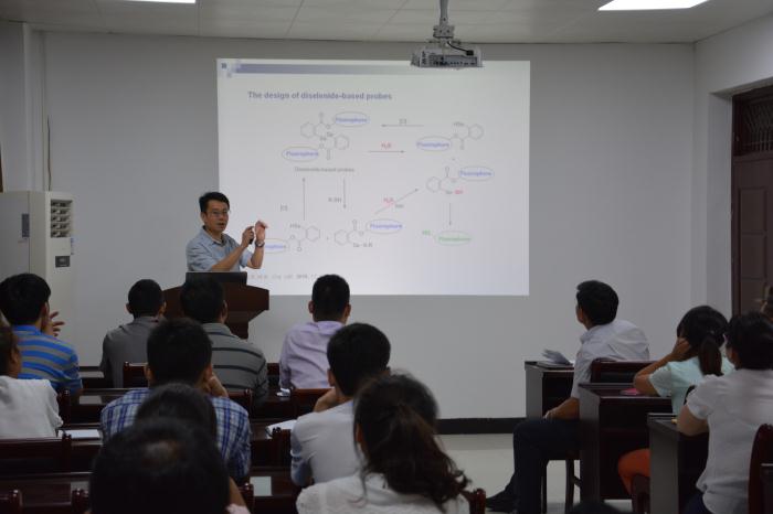 6月14日上午,美国华盛顿州立大学化学系鲜明教授应邀来我院进行学术交流,在化学化工学院学术报告厅为师生做了题“Reaction-basedFluorescent Sensors for Reactive Sulfur Species"的精彩报告,主要介绍如何采用有机化学的手段来构建简便的硫化氢、多硫化物,多硫化氢等活性硫的检测方法,为解决生命科学,生物医学等领域的关键问题提供理论指导。