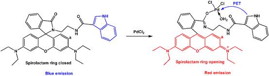 金属钯是药物合成反应中常见的优良催化剂,所以一些药物中就可能会含有残留的钯。因其不可生物降解性,这就使得钯离子会在人体内逐渐富集。钯离子与DNA、某些氨基酸和蛋白质等结合后,干扰人体细胞内的反应过程,给人体健康带来了巨大的潜在威胁。因此,设计开发有效的并能够用于生物体系中Pd2+检测的方法在生命科学及医学研究中具有非常重要的意义。