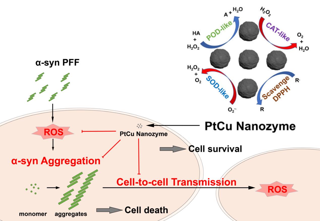 图2:PtCu纳米酶清除活性氧物种和阻止病理α-突触核蛋白细胞间传播示意图