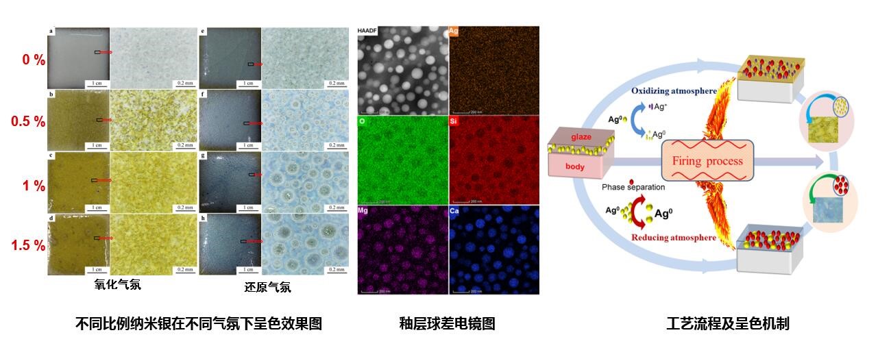 该研究通过引入纳米银及银基复合纳米材料作为呈色剂,探析了其在釉层中的分布状态及呈色机制,实施了釉层微纳结构调控技术,成功实现了材料微纳结构转换对钧瓷呈色的调控,首次在氧化气氛下烧制出金黄色钧瓷釉产品。氧化气氛条件下,部分纳米银被氧化,但仍存在更细小的胶体态单质银,由于纳米银的胶体呈色而使秞层呈现出金黄色。而在还原气氛条件下,纳米银大量团聚成微米级的球状颗粒,不满足银胶体呈色条件,也不存在银及化合物的离子呈色,故在此条件下银元素对钧瓷呈色无贡献,呈现天蓝色主要是由于釉层中存在液液分相结构,其平均尺寸为88纳米,符合Rayleigh散射条件。