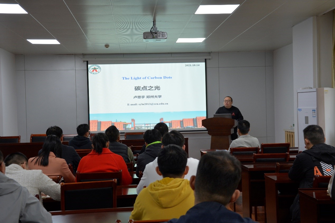 应化工与材料学院邀请,10月14日上午,郑州大学卢思宇教授来我院进行学术交流,与学院师生分享题为“碳化聚合物点初探”的学术报告。报告由我院何伟伟教授主持,我院部分教师、研究生及本科生参与并进行交流和互动。