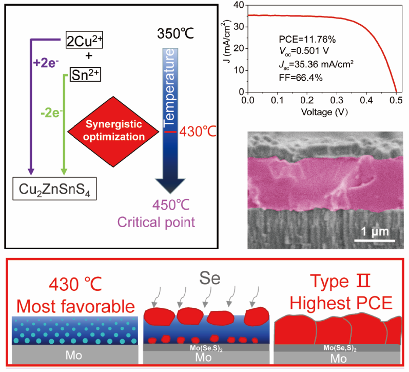 针对上述问题,郑直课题组与河南大学武四新教授合作,通过大量实验提出了一种可控制备大晶粒贯穿结构 CZTSSe的策略,也就是对Cu2+ 、Sn2+的氧化还原反应和预退火温度进行协同优化,通过一系列结构、形貌、电学和光电性能分析,确定了 430 °C 是获得大晶粒贯穿结构最适宜的温度。论文提出了三种类型的薄膜生长模式以及临界预退火温度的概念,成功解释了大晶粒贯穿结构的生长机理和氧化还原速率的提升效应。拥有大晶粒贯穿结构 CZTSSe可以大大降低载流子在界面处的复合,从而有效提升电池效率。目前,在DMF基CZTSSe太阳能电池中,本工作取得了最高的光电转换效率11.76%和最高的开路电压501 mV。