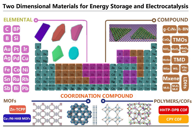 自 2003 年发现石墨烯以来,二维 (2D) 材料(从绝缘体、半导体到导体)因其不同于大块材料的独特性质而受到深入研究。原子级厚度的二维结构赋予此类材料较大的表面积、有利的电荷转移平面和特殊的量子尺寸效应。独特的物理化学、光学和电子特性、高导热性和机械强度,以及电子限制效应使2D材料具有广泛的应用潜力,包括光/电催化、储能、晶体管和传感器等。迄今为止,除石墨烯外,已有数百种2D材料被成功制备成一个巨大的二维库,如2D过渡金属二硫化物(TMDs)、2D层状双氢氧化物(LDHs)、2D金属有机骨架(MOFs)、2D过渡金属碳化物/碳氮化物( MXenes)、过渡金属氧化物 (TMO)、石墨碳氮化物、磷、硅烯、六方氮化硼、2D金属和2D钙钛矿,以及2D聚合物和共价有机化合物 (COF),所有相关的2D材料如图1所示:
