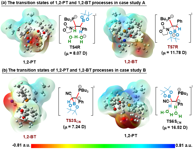 图3. Case study A的甲苯溶剂和Case study B的二氯甲烷溶剂中竞争的1,2-PT和1,2-BT过程过渡态结构的静电势表面图。