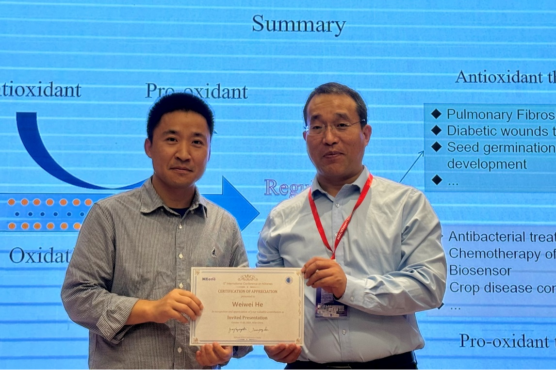 我院何伟伟教授和司晶晶博士参加了此次会议。在Synthesis, characterization and theoretical investigation of MXene/MBene分会场,何伟伟教授以《MXenes: Structure and Redox Evolution for Biological Implications》为题做了邀请报告。报告介绍了纳米催化材料与应用团队近年来关于MXenes纳米材料的结构演变及其在治疗肺纤维化、糖尿病创面及抗菌等疾病方面的应用,为MXenes纳米材料的结构性质构效关系研究提供了新的见解,在会场上引起了研究学者们的广泛的关注与热议。
