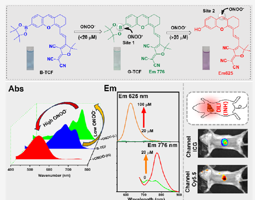 过氧亚硝基阴离子(ONOO–)是体内一种重要的活性氧物质(ROS),可以与蛋白质共同作用维持体内的生物氧化还原平衡。同时,其浓度的变化也可以作为评价多种疾病(如癌症、心血管疾病、药物肝损伤等)的重要指标。然而,在复杂生命体内的精确检测ONOO–的含量波动仍然是一项具有挑战性的工作。许志红教授团队合理地设计了一种双增强发射的近红外次序激活荧光探针(B-TCF)用于测量ONOO-的波动变化。