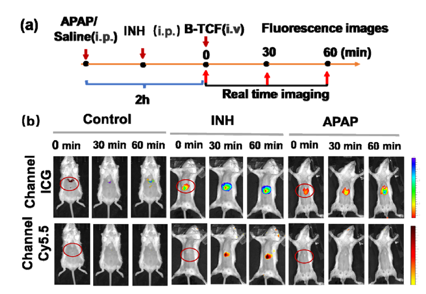 探针设计基于丙二腈半花菁染料为母体,硼酸酯和氧杂蒽为双响应位点,在ONOO–低浓度时,硼酸酯发生水解,高浓度时,氧杂蒽环被破坏,探针在分别在776和625 nm处对不同浓度范围表现出双增强近红外荧光发射,能够区分活细胞中低浓度和高浓度的ONOO–。此外,B-TCF还显示了优异的选择性、灵敏度和反应速率。通过在相关动物模型中的应用,B-TCF成功监测了异烟肼(INH)和对乙酰氨基酚(APAP)等药物诱使体内ONOO–的浓度上升,证实了INH和APAP肝损伤ONOO-浓度差异。该项研究发展了第一个双增强串联激活近红外荧光探针,用于监测体内ONOO–的动态变化,并且在评估不同阶段的药物性肝损伤方面显示了巨大的应用前景。(图片来自化工与材料学院)