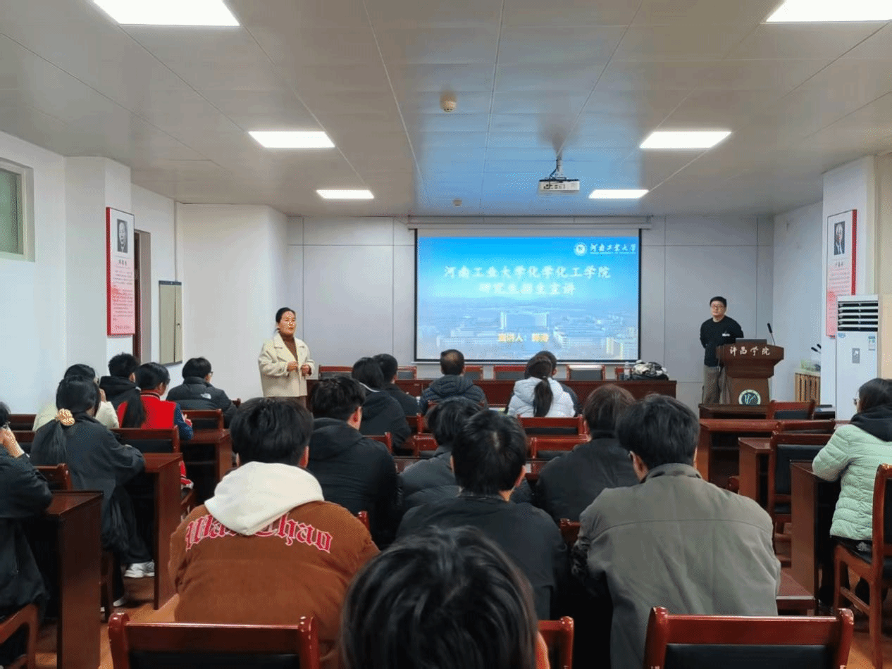 2025年3月12日下午4:20,我院于化材楼S302举行河南工业大学考研宣讲会,会议由院党委副书记张学燕主持、部分2026届毕业生及低年级学生到场参会。