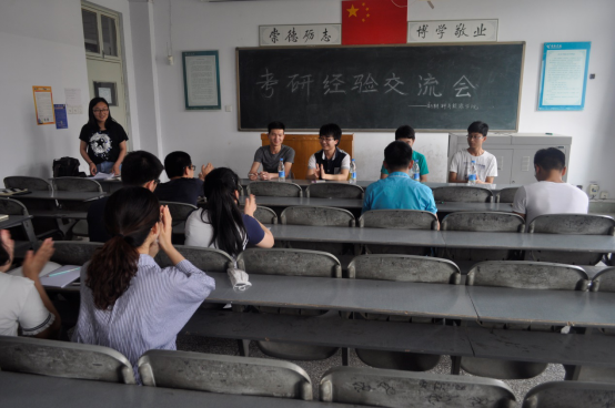 会议初始,由刘富生等四人依次介绍他们的考研经历和学习经验,为大家细致讲述了考研所考课程的考试范围以及在他们的考研过程中总结的复习经验,给大家提出了“真题最重要,做题不在多而在精,复习时要多次重复”等宝贵建议,并且就如何准备研究生各阶段考试、如何安排学习时间提出很多好的建议。最后,同学们现场提问了有关如何择选专业等问题,他们对每个问题都做了耐心的回答。
