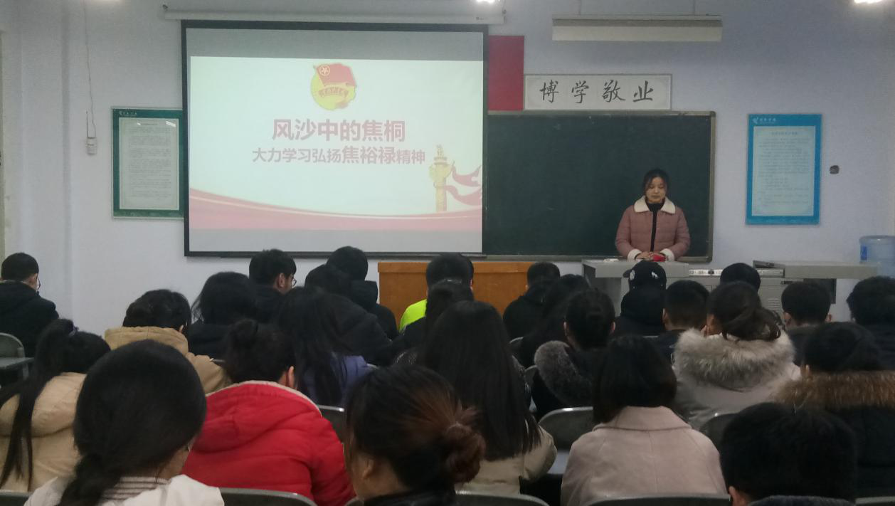 12月25日下午,我院2017级材料科学与工程一班团支书刘秋丽带领大家重温了焦裕禄同志的先进事迹,阐释了焦裕禄同志那种“鞠躬尽瘁、死而后已”的高尚情怀,同时,通过最美校长张伟的事例引发大家对为何学习弘扬焦裕禄精神的思考,并从推动科学发展、促进社会和谐及推动党的建设三个方面为同学们解答。接着,播放《改革开放 关键一招》焦裕禄事迹节选视频,引发同学们对焦裕禄精神是否过时的思考。在大家发表过自己的看法后,团支书用一句话进行总结:那些看似过时的精神会成为永恒,为迷茫的心灵点亮一盏明灯。最后,团支书并号召大家将焦裕禄精神发扬光大,在实际学习和工作中,保持好韧劲、拼劲。
