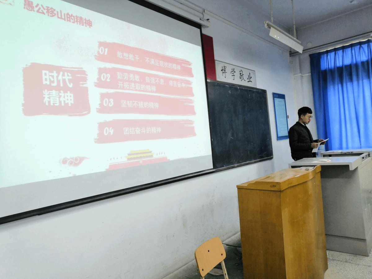 12月18日上午,我院18新能源材料与器件一班团支书贾亚夺同学以寓言故事“愚公移山”开篇为同学们讲解愚公移山精神——创新、实干、为民,并通过举例袁隆平、黄大年、任伯年和史铁生等人物的主要事迹,使同学们进一步了解愚公移山精神的内涵。最后,团支书进行讲述在人类历史的长河中,任何一个民族的生存和发展,都离不开精神文化的指引和支撑,并号召同学们践行愚公移山精神,排除万难,争取胜利。