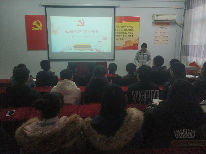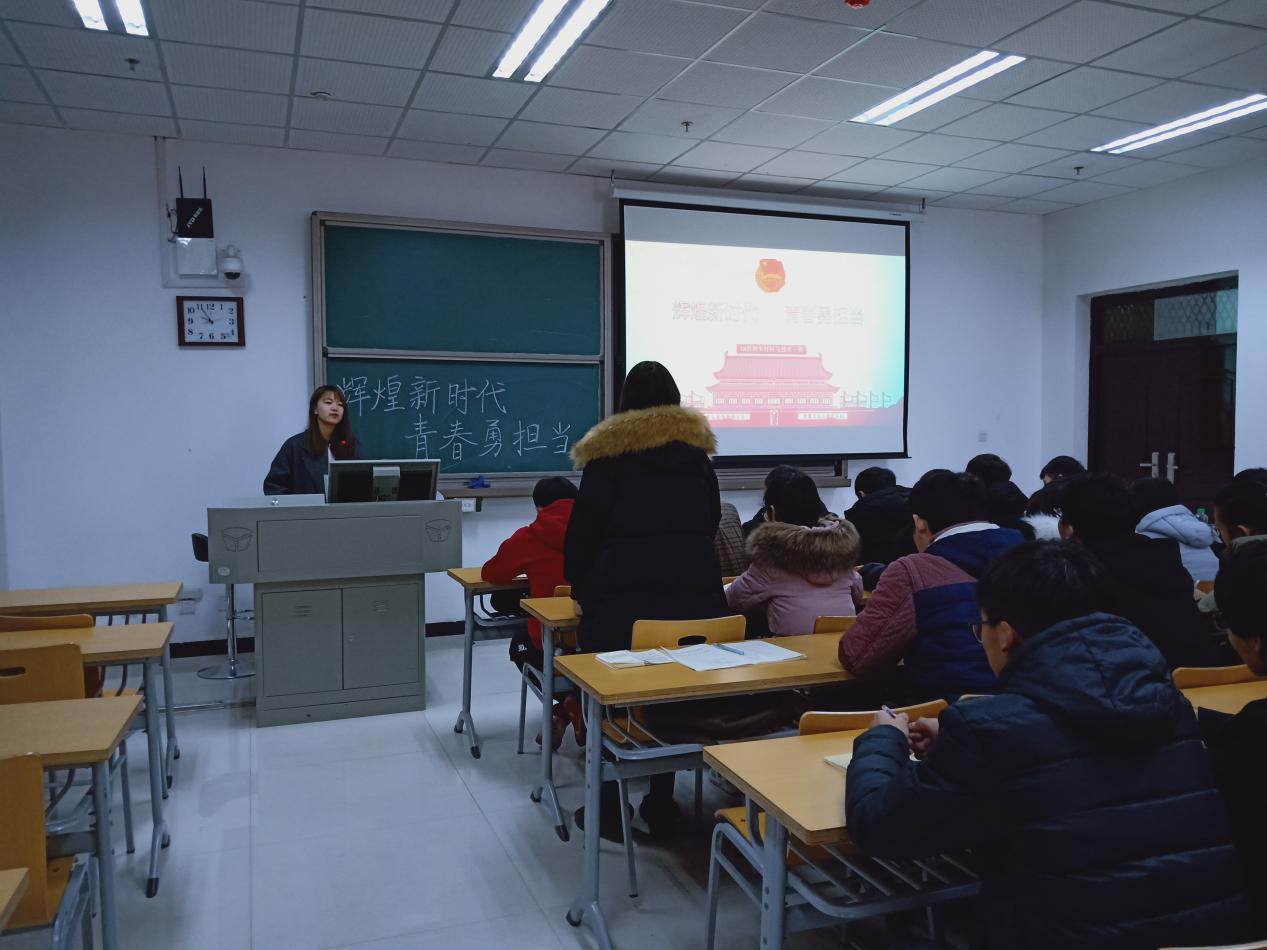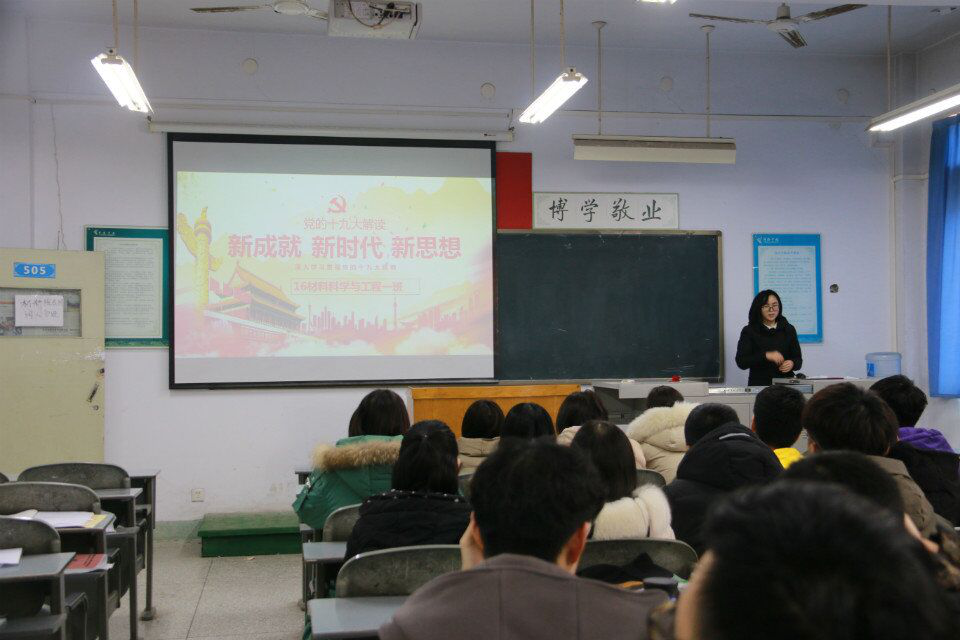12月25日下午,我院2016级材料科学与工程一班团支书胡爱玉紧扣党的十九大报告,紧紧围绕习近平新时代中国特色社会主义思想这个主线,向本班同学阐述了十九大报告的亮点,深入浅出地对党的十九大提出的新成就、新思想及新时代作了全面而又突出重点的解读。接着从经济,改革,民主法治建设,思想文化,人民生活,生态文明,强军兴军、港澳台工作,外交布局,从严治党等方面分别向同学们阐述十八大以来的五年内我们党所取得的成就。同时,向大家讲解了“两个阶段”的含义,新时代我国社会的主要矛盾,并组织大家讨论身为大学生应该怎样在新时代做出新成就。