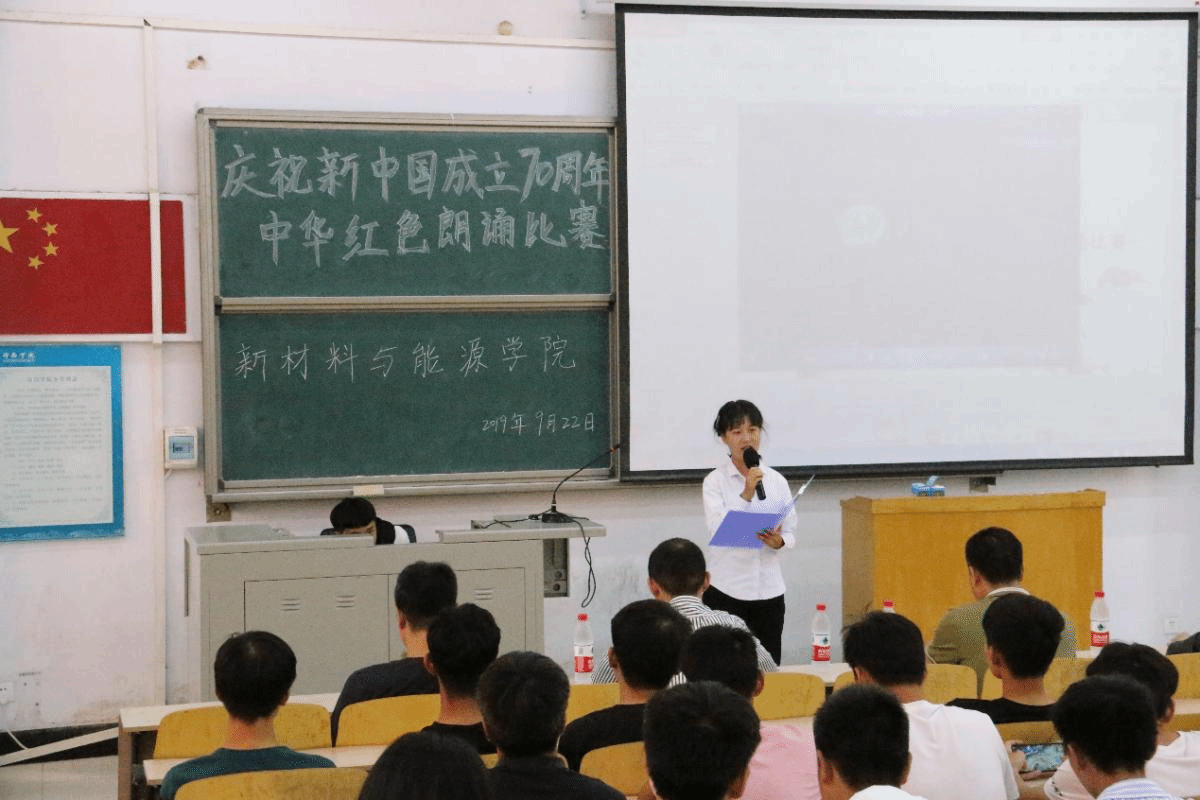 为推进校园推广普通话活动,我院于9月22日下午在A合五教室举办了庆祝新中国成立70周年中华红色朗诵比赛。此次比赛邀请到教务处副处长杜书廷、新材料与能源学院党总支李立夏书记、副院长李品将及文学与传媒学院万光明老师出席点评。