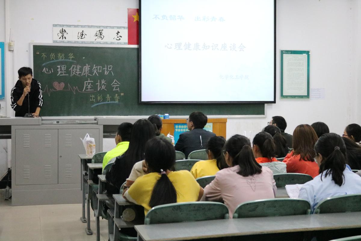 2018年10月19日晚7:00,化学化工学院于c-101教室举办了以"不负韶华,不负青春"为主题的心理健康知识座谈会,旨在向本院学生普及心理健康知识,普及心理健康知识的内容,提高大家的心理健康水平。由女生心理保健部部长王佳利担任主持人。