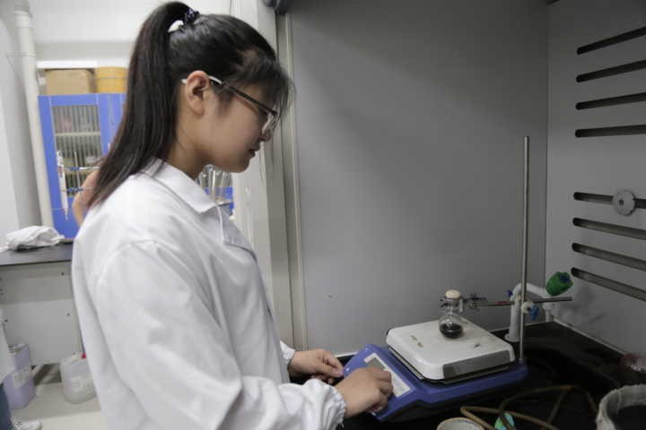 实践队对搜集来的焗油人发进行处理:对搜集来的头发进行水洗,除去头发上的污物;用准备好配比的浓硫酸对头发“剥鳞”处理;配制保护剂及络合剂,使“剥鳞”后的头发与之络合催化,让络合剂与人发纤维内部的黑色素粒子结合;漂白氧化…在队员们的期待和注视下,在对照劳尔色卡,一缕“黑色”的原发,变成了比工业级更好的“象牙白色”。