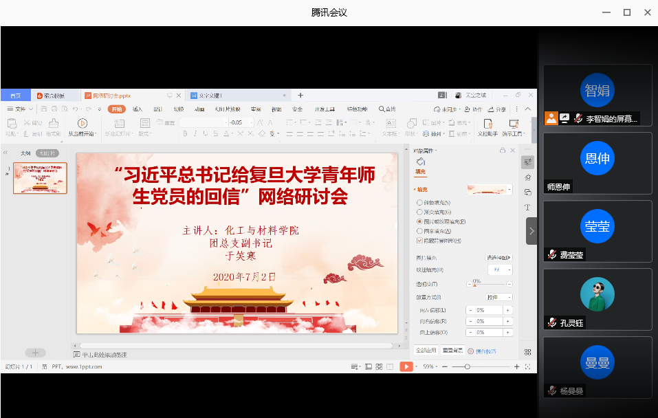 7月2日,我院在腾讯会议上召开“习总书记给复旦大学青年师生党员的回信”网络宣讲会。此次会议由我院团总支副书记于笑寒主讲,各级各班团干部全部参会。