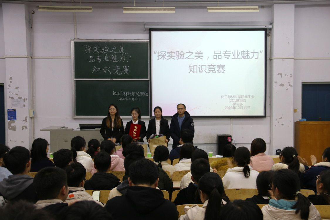 2020年12月11日,我院于蕴韬楼A合六举办“探实验之美,品专业魅力”知识竞赛决赛,院党委副书记张学燕、团委书记于笑寒、18化学班导师张万强、19材料班导师1钞春英、19材料2班导师梁玮、18新能源蔡锟作为评委,我院19、20级学生参加。