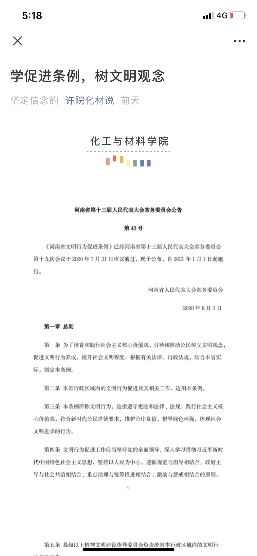 为落实贯彻我校关于“河南省新时代文明实践推动周”相关工作,学习《河南省文明行为促进条例》和《许昌市文明行为促进条例》,我院于3月2日-3月3日组织各级各班通过开学第一次班会开展学习促进条例活动。