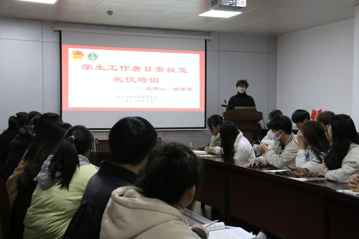 2021年11月23日,为进一步提升校园文化氛围,培养我院学生工作人员养成良好的社交礼仪行为习惯,我院学生会于化工楼S302开展了学生工作人员日常礼仪培训。本次培训由我院礼仪队负责人牛佳一和胡君华主讲,我院全体学生会工作人员参加了此次培训。