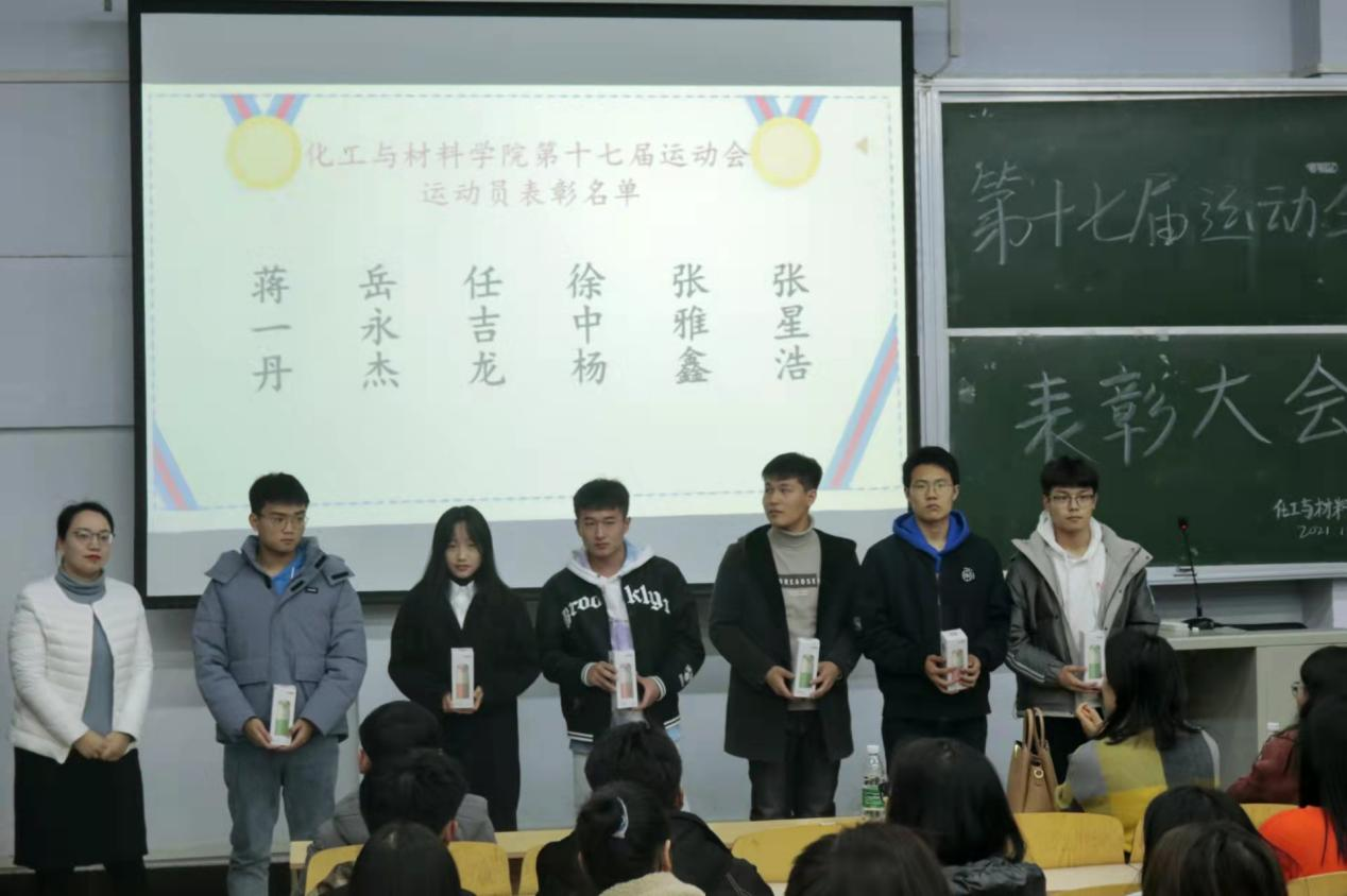 2021年11月27日下午,为表彰化材学子在许昌学院第十七届运动会中奋勇拼搏、喜获佳绩,我院于蕴韬楼A合八教室召开运动会表彰大会,党委副书记张学燕、团委书记于笑寒、20级辅导员张东琳、21级辅导员牛景锐及部分同学参加本次大会。