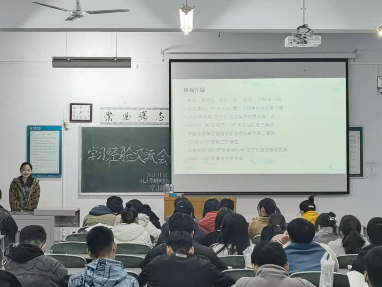 2021年11月28日晚7:00,我院于启智楼C-101至C-104教室举行新生学习经验交流会,由化工与材料学院学生会学习部主办,邀请我院各专业成绩优异的高年级同学为21新生们分享学习经验,21级全体同学参加。