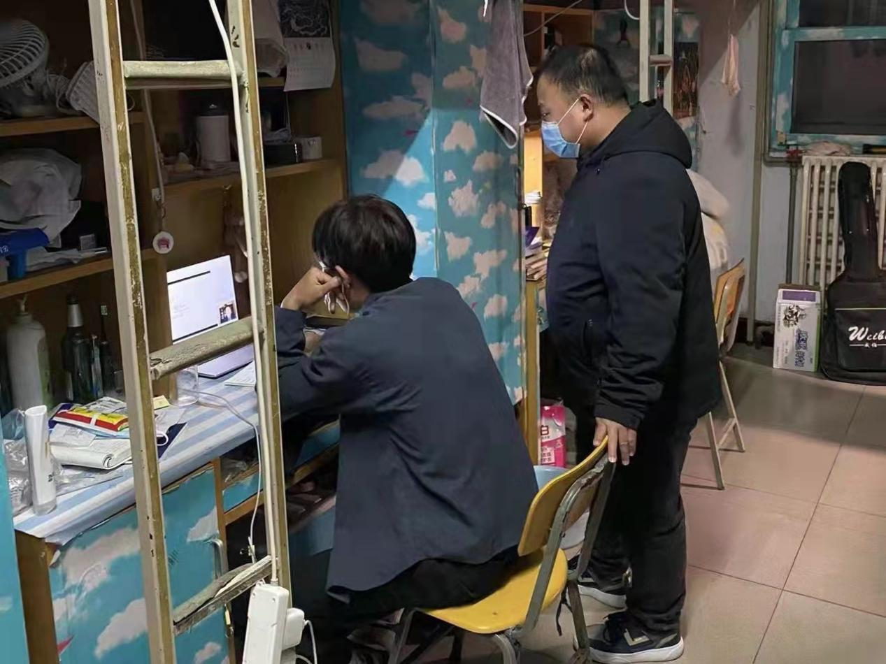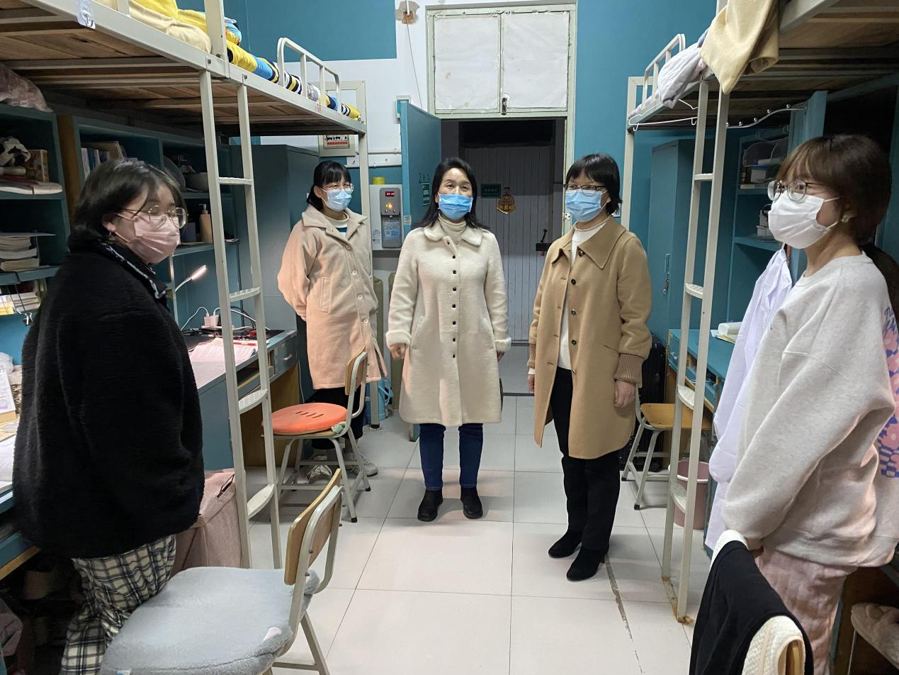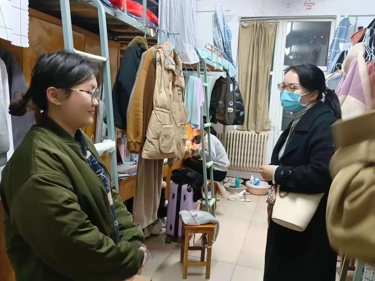 为持续抓好疫情防控工作,了解学生们的思想动态、生活情况,激励大家以更好的精神面貌投入学习生活中,2022年3月22日晚,我院院长张艳鸽、党委副书记张学燕、团委书记于笑寒、辅导员胡泊老师、赵灿老师、张东琳老师、牛景锐老师一行深入学生宿舍走访慰问。