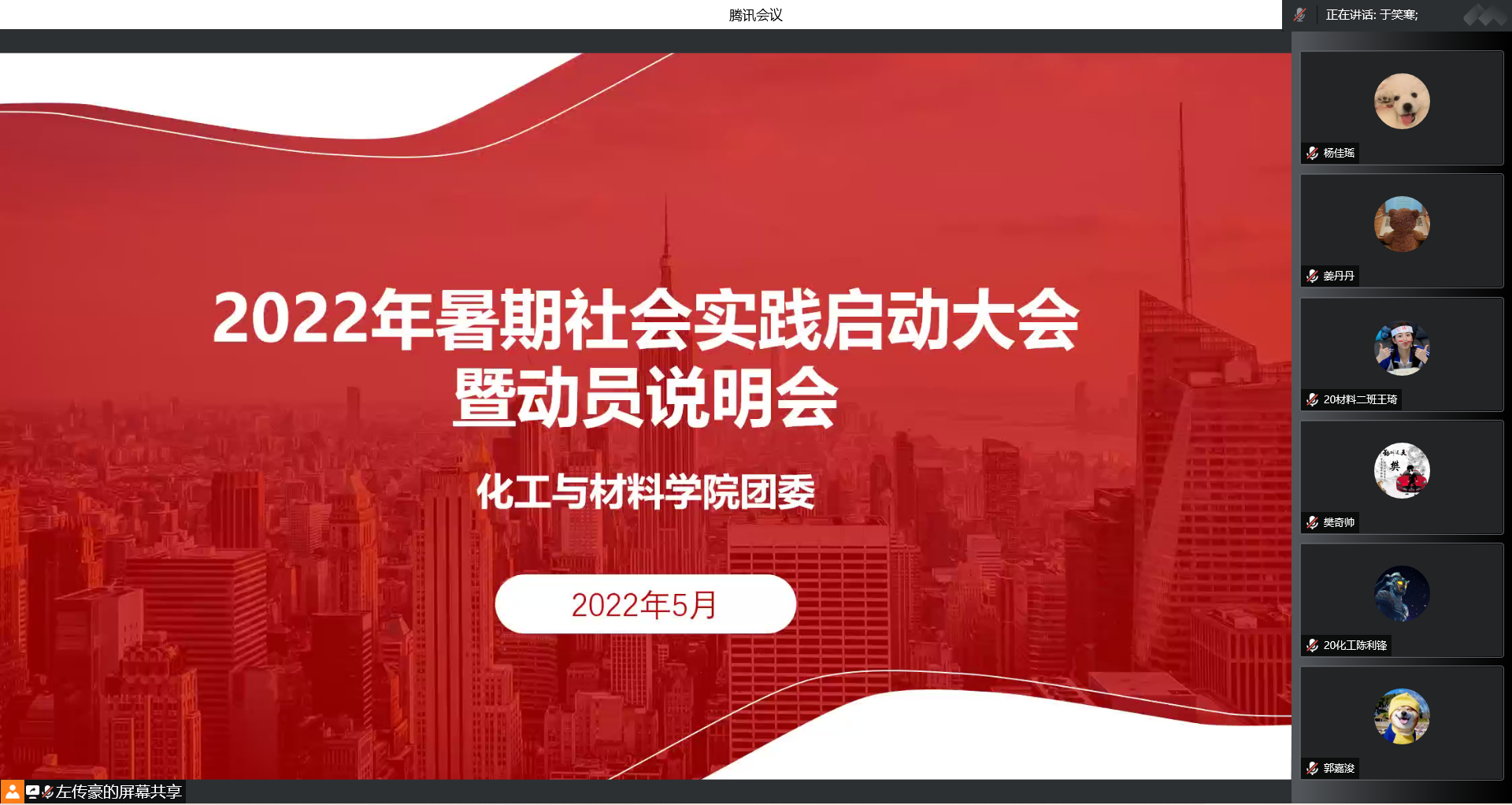 2022年5月30日,为进一步做好2022年大学生暑期社会实践工作,积极引导学生将理论与实践有机结合,我院2022年暑期社会实践启动大会暨动员说明会通过腾讯会议顺利召开。会议由院团委书记于笑寒主讲,19级、20级、21级全体学生参会。