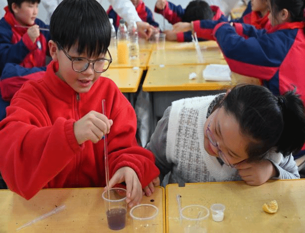 韩老师以“维生素C的科学密码”为主题,从生活“衣食住行”中的化学到“人体每天需要的六大营养素”,为孩子们搭建了“生活-科学-健康”的认知桥梁,实现了科学思维的深层启蒙。在维生素C的测定实验中,韩老师从维生素C的历史溯源简述了Vc从坏血病治疗中的应用到荣获诺贝尔奖的三百年进展史,引导学生理解“化学中蕴藏着生命健康的答案”。在实验环节,韩老师和我院大学生志愿者指导学生利用碘的淀粉溶液分别检测柠檬、桃、梨三种果汁中的维生素C含量。通过维生素C与碘的作用原理的解释,让学生了解维生素C如何通过抗氧化作用帮助人体抵抗自由基、增强免疫力,使抽象的“氧化还原反应”变得可感可知。孩子们也进一步明白课本上的化学原理,就藏在日常饮食的健康密码中,实现了从“知现象”到“懂本质”的认知跨越。