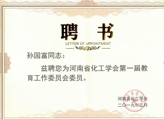 会议首先举行河南省化工学会教育工作委员会成立仪式,河南省化工学会理事长、洛阳理工学院校长刘国际教授为新当选的首届委员会成员颁发聘书。我院教师孙国富老师以河南省高校化工类教学指导委员会委员身份当选为河南省化工学会教育工作委员会委员。