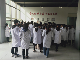 吕亚军经理向同学们讲解企业概况▲ 黄春阳车间主任带领学生参观GMP固体制剂车间▲